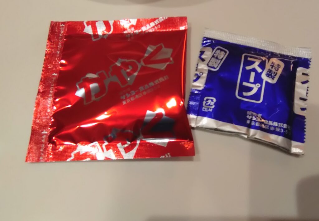 中から出てきたのは赤い袋の「かやく」と青い袋の「粉末スープ」。