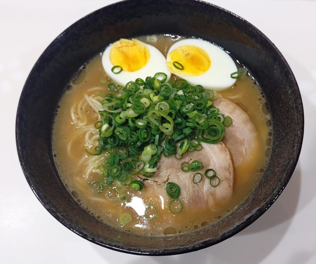 やっぱりラーメンにはネギが欠かせません。今回は大阪府産の青ネギをたっぷりと準備。チャーシューは市販のパックを買ってきたのですが、意外と肉厚でジューシー。さらに半熟気味に仕上げたゆで卵を用意することで、見た目から本格的な一杯を演出しました。