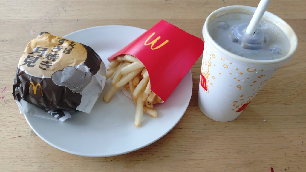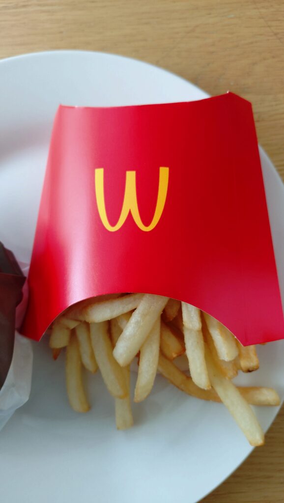 セットに欠かせないのがポテト。マクドナルドのポテトはやはり安定の美味しさで、今回も期待通り。ほどよい塩加減とサクッとした食感で、ついつい手が止まらなくなります。特に月見シリーズの濃い味バーガーと一緒に食べると、相性は抜群。