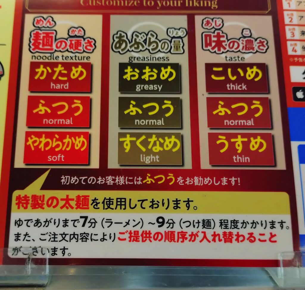 - 麺の硬さ:かため・ふつう・やわらかめ