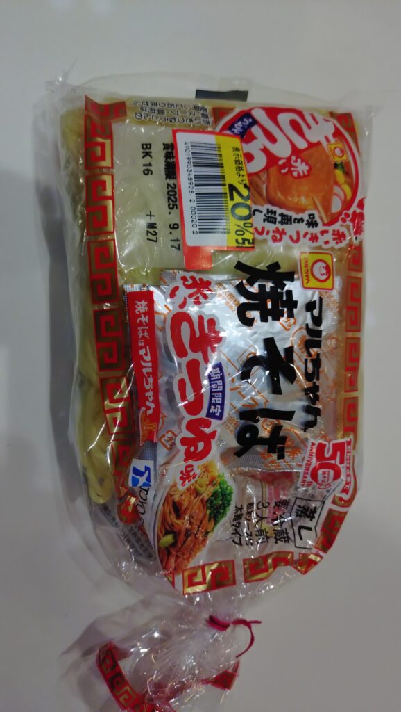 そんなときに助かるのが、スーパーで見つける 割引シールの貼られた商品。今回は滋賀県の平和堂で見つけた、マルちゃん焼きそばを20%引きで購入しました。