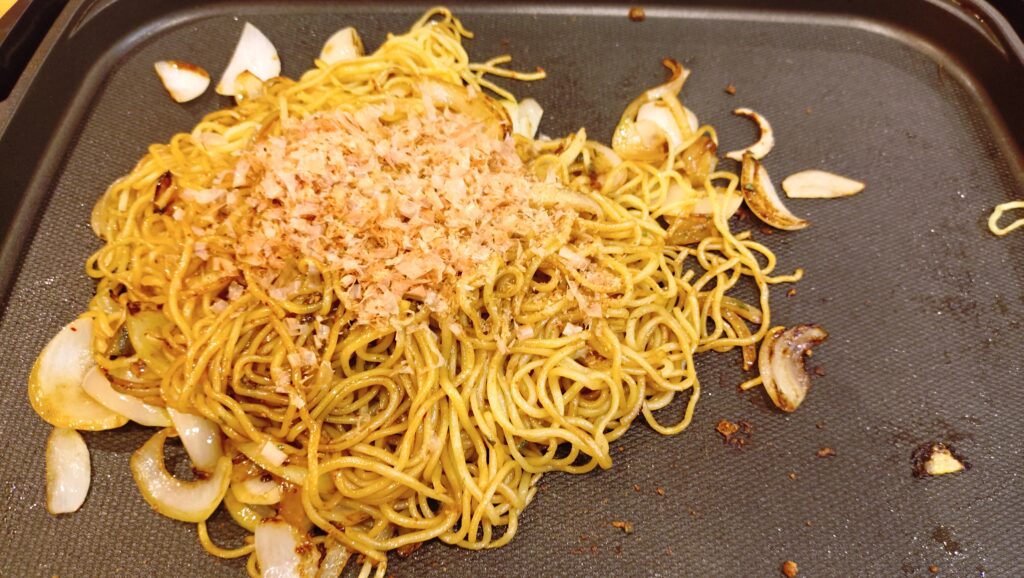 それでも玉ねぎだけは常備していたので、それを具材に使うことにしました。最後に鰹節をふりかければ香りもアップ。少ない食材でも、しっかり美味しい焼きそばになります。