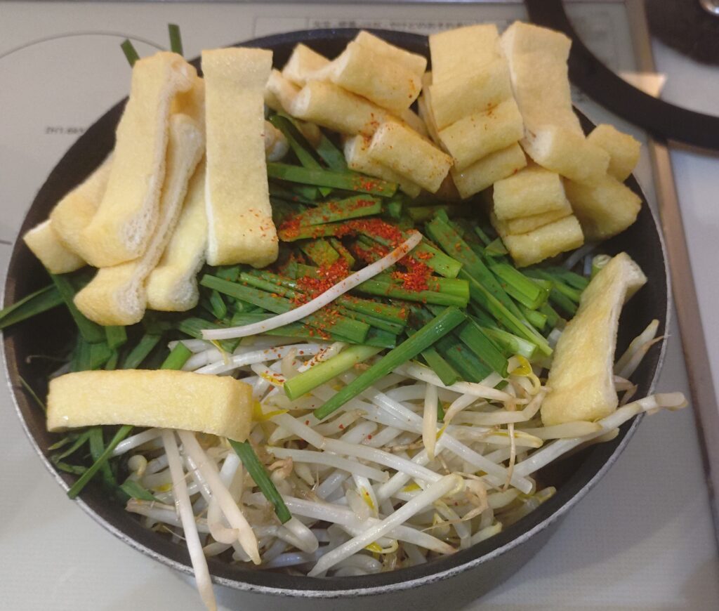 にらやもやしがその旨味をしっかり吸ってくれます。