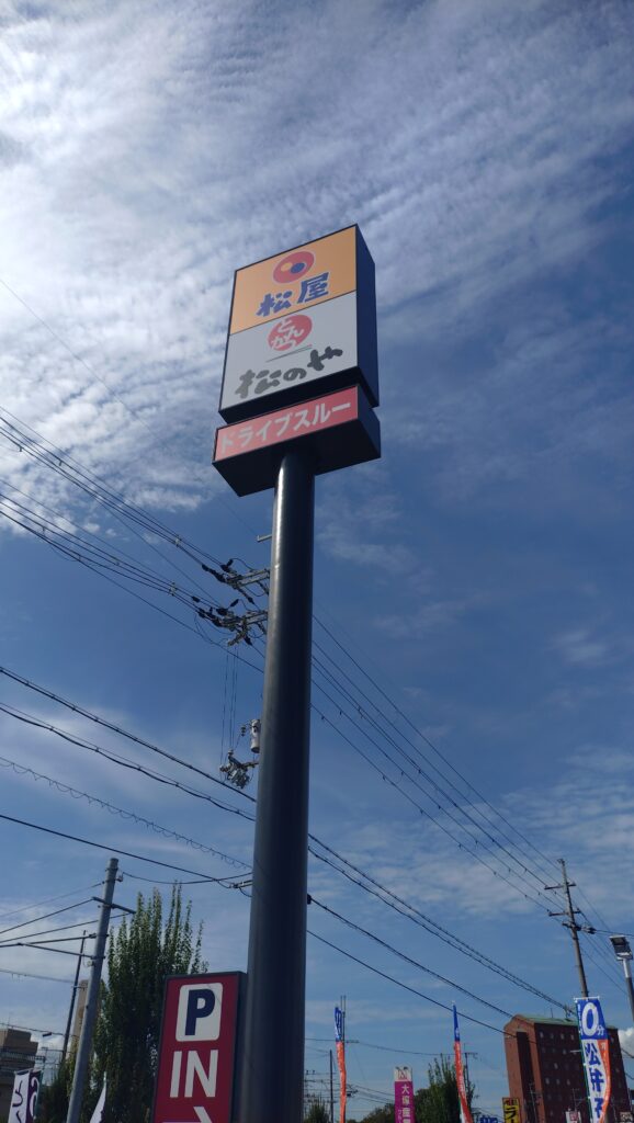 国道沿いに堂々とそびえる看板。松屋の牛丼でおなじみのロゴと、とんかつ専門「松のや」のロゴが並んでいるのは、見ただけでワクワクします。
